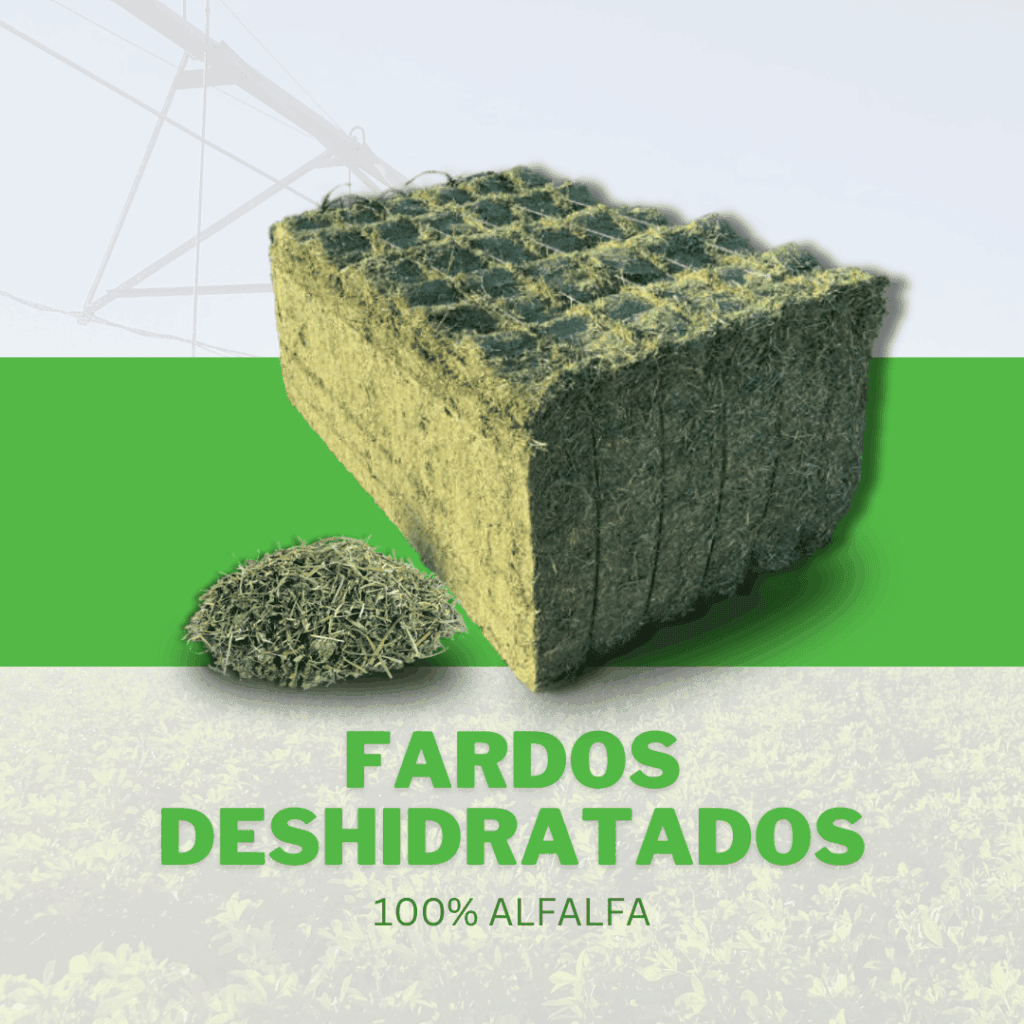 Producto obtenido a través de la compresión de alfalfa deshidratada mediante la ventilación forzada de aire caliente, cuya presentación es en fardos de diferentes tamaños.